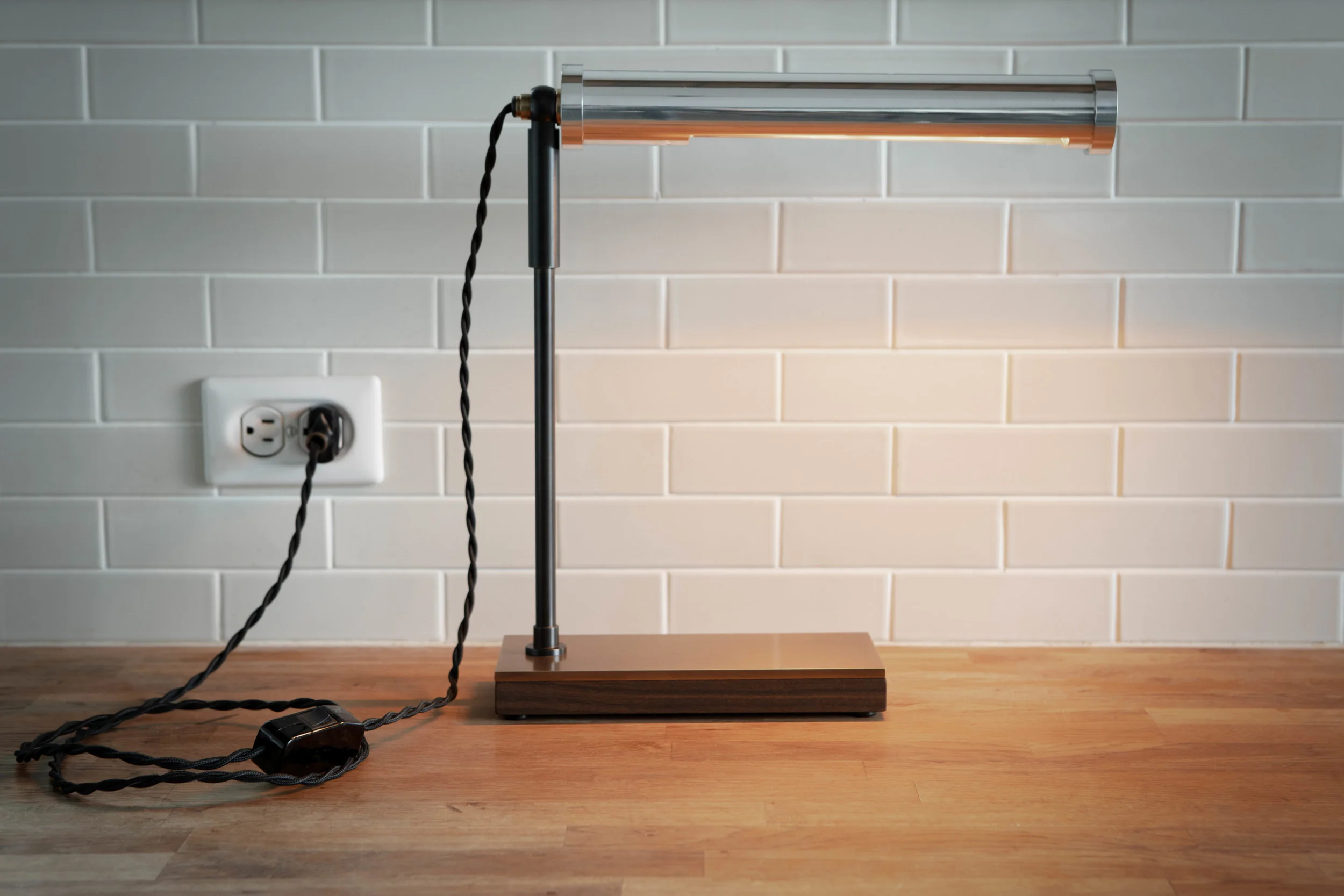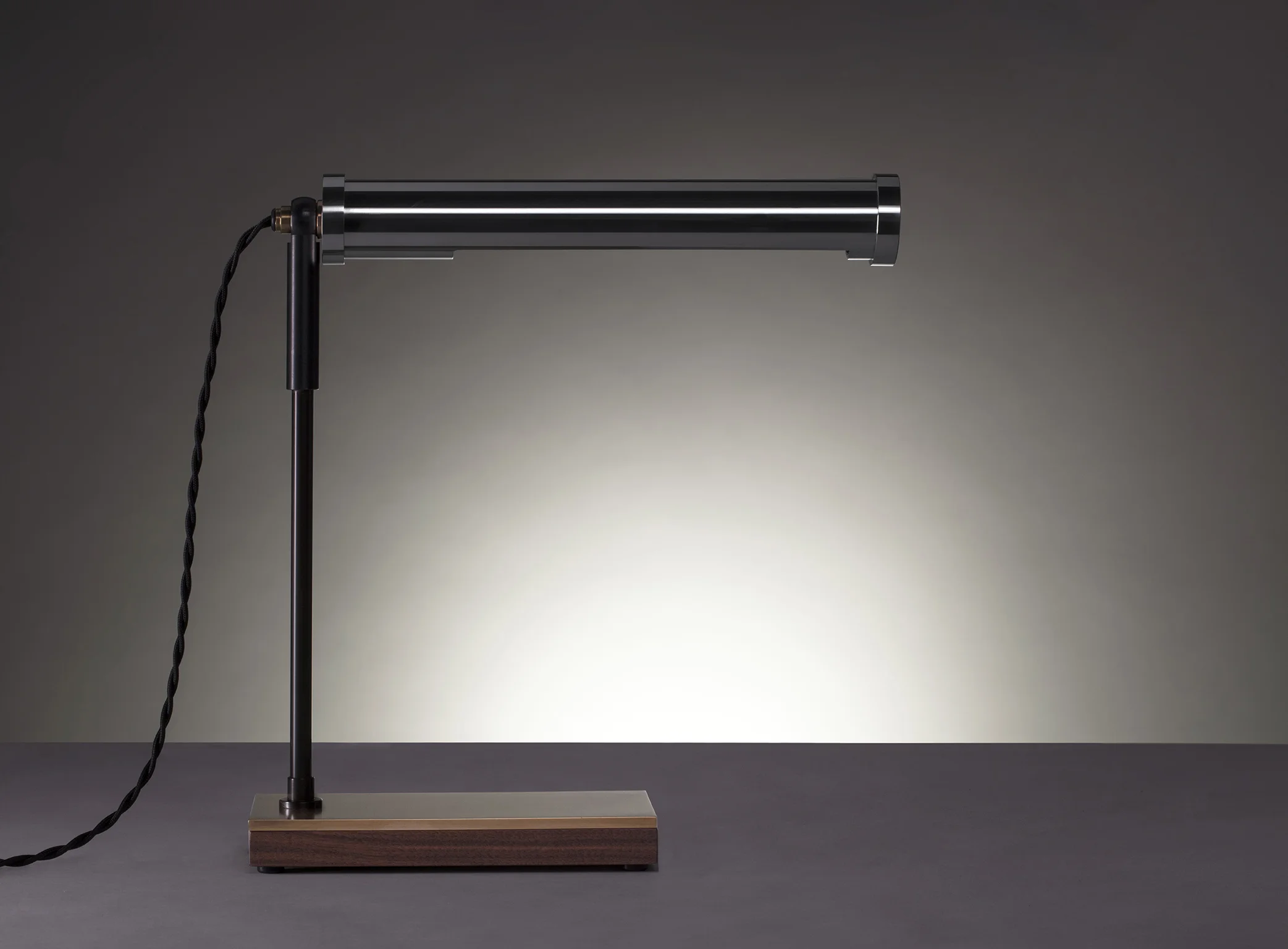 Inspired by the streamlined forms found in aviation design, the aluminum cylinder that houses the fixture’s LED light source cantilevers over the base, as if in flight.