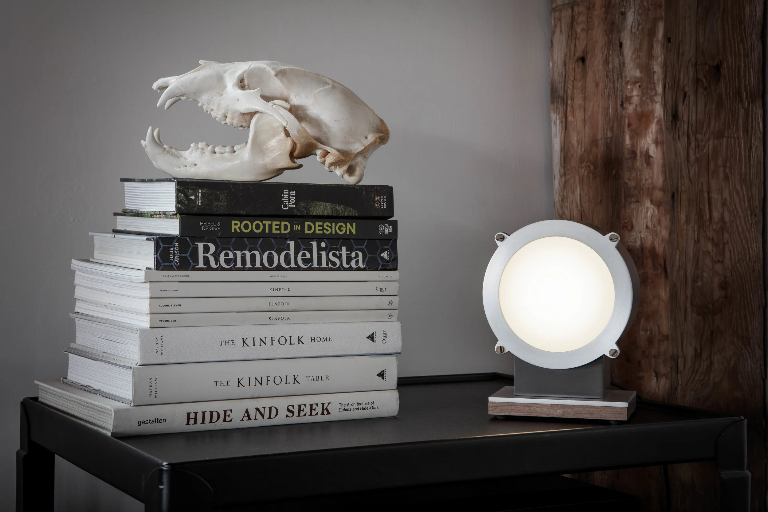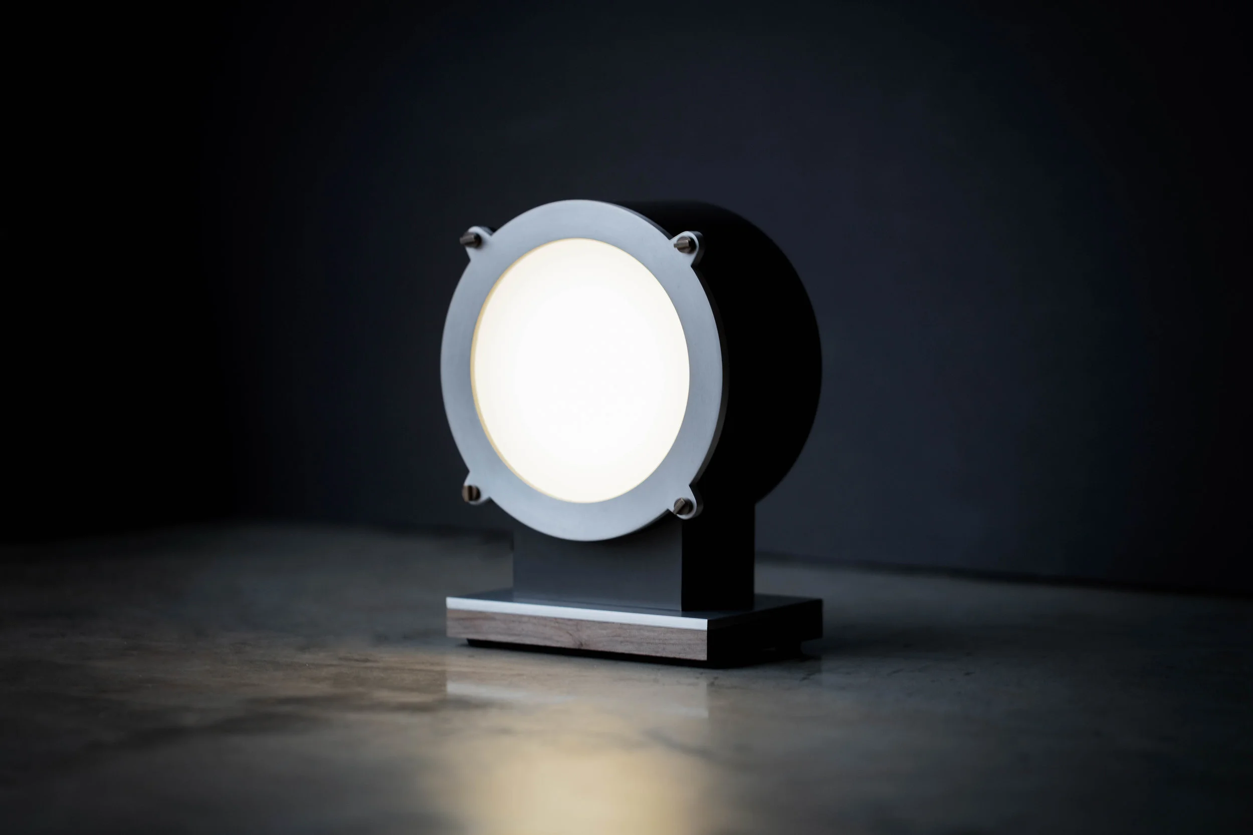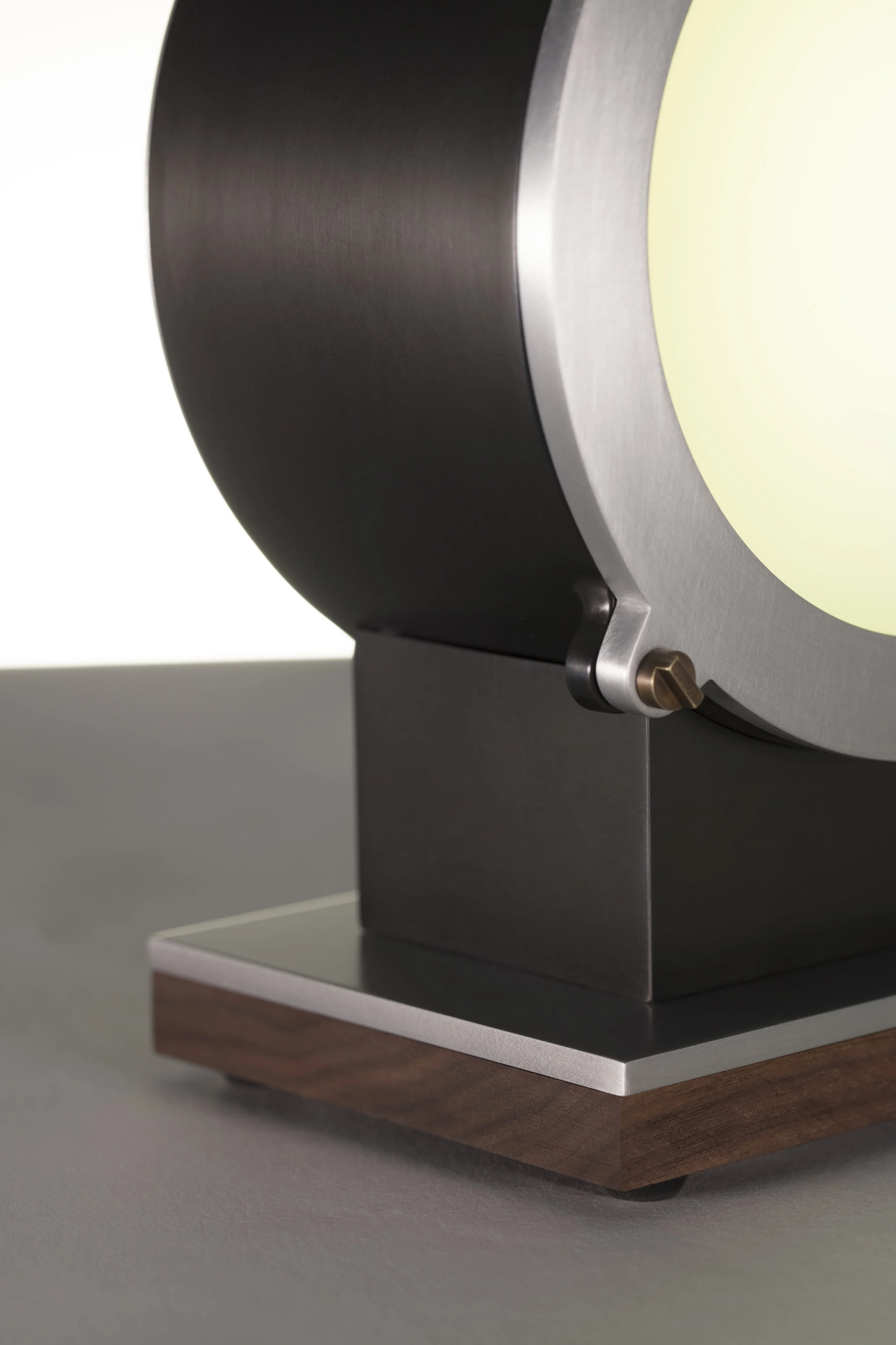 The Mini-Tank, a smaller version of our Tank Light, combines hand-finished steel, burnished aluminum, and oiled walnut.